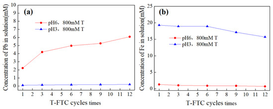 Ion concentration in solution varied with T-FTC cycle times after T-FTC of LBJ. (a) Pb; (b) Fe.