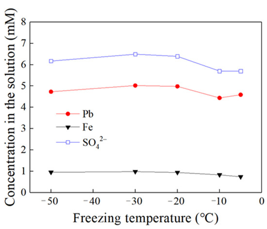 The experimental conditions included 1 g of LBJ, a thiourea concentration of 800 mM/L, a liquid–solid ratio of 30 mL/g, a pH value of 6, and 6 freeze–thaw cycles to study the release of lead, iron, and sulfate ions from the LBJ into the solution at freezing temperatures ranging from −5 °C to −50 °C. The results presented in Figure 6 show that the release of Fe remains almost constant at pH 6 as the freezing temperature increases, remaining below 1 mM/L (0.6% of total Fe). The release of Pb increases initially, then decreases, and increases again as the freezing temperature increases. Low or high freezing temperatures are not favorable for the release of Pb, with the optimal release occurring at temperatures lower than −20 °C. The release behavior of SO42− and Pb is similar, indicating that the release of SO42− is mainly due to the release of PbSO4 by the reaction of thiourea with lead.