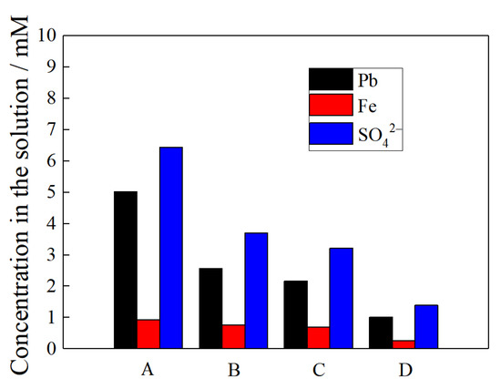 The experimental conditions were as follows: In total, 1 g of LBJ, a thiourea concentration of 800 mM/L, a liquid–solid ratio of 30 mL/g, a pH of 6, and 6 T-FTC cycles. Different freeze–thaw methods (A: frozen at −20 °C for 12 h and thawed at 20 °C for 12 h; B: frozen in liquid nitrogen for 5 min and thawed at 20 °C for 12 h; C: frozen in liquid nitrogen for 5 min and thawed at 20 °C for 6 h; and D: frozen in liquid nitrogen for 5 min and thawed in a microwave for 5 min) were investigated to determine their effect on the release of lead, iron, and sulfate ions from LBJ. The results presented in Figure 7 demonstrate that the release of Pb and SO42− was reduced to a certain extent after rapid freezing using liquid nitrogen under the B mode. Specifically, the concentration of Pb in the solution decreased from 5.02 mM/L (31.64% of total Pb) to 2.56 mM/L (16.13% of total Pb), while the concentration of SO42− also decreased from 6.44 mM/L (4.92% of total) to 3.70 mM/L (2.83% of total). In contrast, altering the thawing method (C and D) by using ultrasonic or microwave rapid thawing was found to inhibit the release of Pb, Fe, and SO42−. Moreover, the rate of ion release was inversely proportional to the speed of thawing. Notably, the release of Pb decreased to 1.01 mM/L (6.39%) with microwave rapid thawing, indicating that this thawing method is unsuitable for the present purposes.