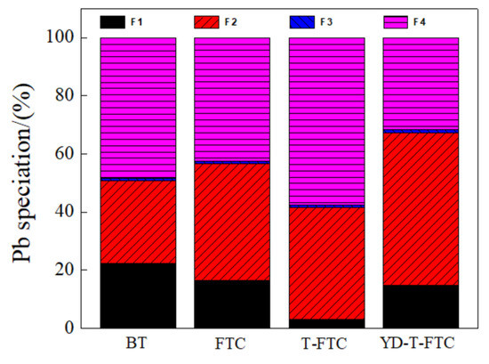 Figure 8 displays the lead transformation in LBJ under various freeze–thaw treatments. BT refers to the LBJ before treatment, FTC indicates a sample subjected to a blank freeze–thaw cycle without thiourea, and T-FTC refers to a sample treated with 800 mM/L of thiourea using T-FTC. The other freeze–thaw conditions included a liquid–solid ratio of 30 mL/g, a freezing temperature of −20 °C, a pH value of 6, and 12 freeze–thaw cycles. The YD-T-FTC sample was quickly frozen for 5 min using liquid nitrogen, with the other conditions the same as those of the T-FTC sample.