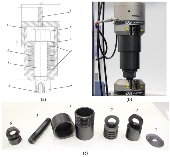 The equipment shown in Figure 2 consists of the following elements: body—1, consisting of two parts connected by means of a threaded connection, a package of plate springs—2; a guide rod—3; compensation rings—4; hardened washers—5; fastening nuts for fixing the package of springs—6; a rod to install the equipment in the grips of the testing machine—7; and a threaded hole for fastening in the equipment of the test specimen—8. Elements 3 and 5 are hardened to prevent damage and bite to the springs when the package is loaded. There is a patent (RU 153985 U1) for the rigging with a variable stiffness used in the work for tensile tests with various loading parameters.