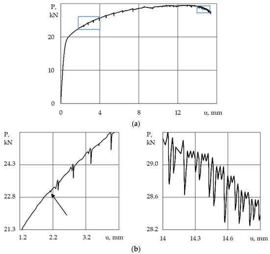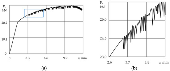 The load-displacement curve for the loading system’s stiffness of 18 MN/m (a) and the enlarged section (blue box) of the curve illustrating the discontinuity of the plastic flow (b).