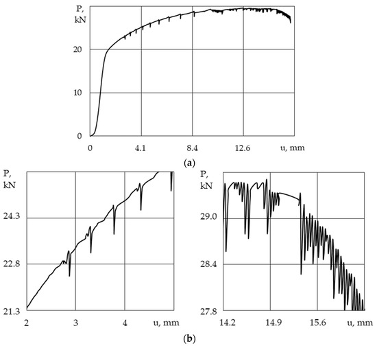 The load-displacement curve for the loading system’s stiffness of 50 MN/m (a) and enlarged sections of the curve illustrating the discontinuity of the plastic flow (b).