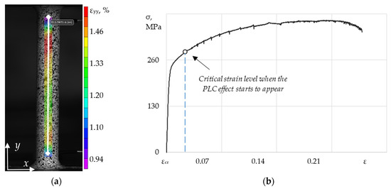 To determine the level of critical deformation (εcr), at which the effect of the jerky flow begins to appear, deformation diagrams were constructed by using an additional software module of the video system called the ‘virtual’ extensometer (Figure 8a). The ‘virtual’ extensometer allows for the non-contact determination of the deformation in the gauge length of the specimen based on the displacement fields’ analysis. Thus, the ‘stress-strain’ curves for each group of the samples were obtained. As an example, Figure 8b shows a deformation diagram for a specimen tested at the maximum level of the loading system (120 MN/m).