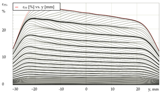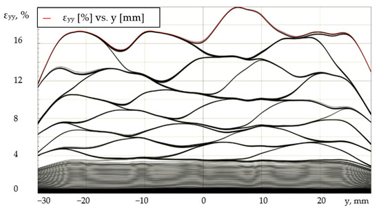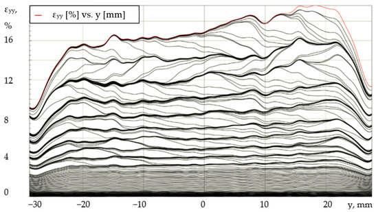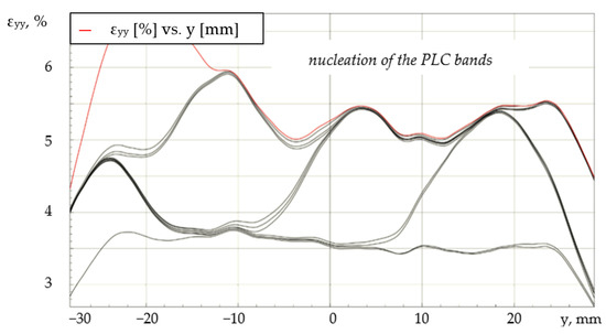 To visualize the formation and propagation of PLC bands, the authors proposed the presentation of the results in the form of a series of deformation profiles (εyy) plotted along the length of the sample at equal time intervals. With the help of this representation, it is possible to characterize the basic laws and kinetics of the spatial-time inhomogeneous fields. As an example, Figure 9 shows a series of εyy profiles for a specimen tested at the loading system stiffness of 120 MN/m. The time interval between the deformation profiles is 2 s. The origin of coordinates for the abscissa axis (Oy) is fixed in the center of the gauge length of the specimen. Under uniaxial tension of the aluminum-magnesium alloy, the effect of quasi-periodic homogenization of plastic deformation is observed, which consists of alternating stages of localization of the plastic flow when PLC bands appear and propagate, as well as stages of macroscopic leveling of longitudinal deformations on the surface of the cylindrical sample.