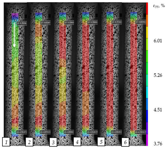 We consider a series of longitudinal strain profiles (Figure 11) for a single strain band shown in Figure 9. Numbers 1–6 (Figure 11) denote the profiles of longitudinal deformations, for which Figure 10 shows the corresponding strain fields. The propagation of a single strain band proceeds uniformly from one capture to the opposite one with a constant speed of the band’s front movement.