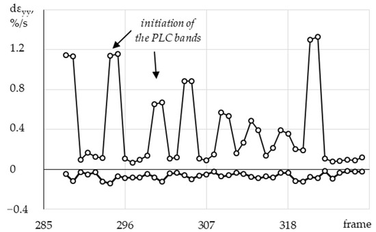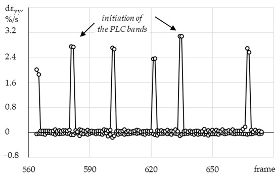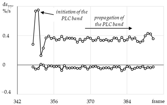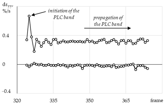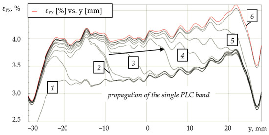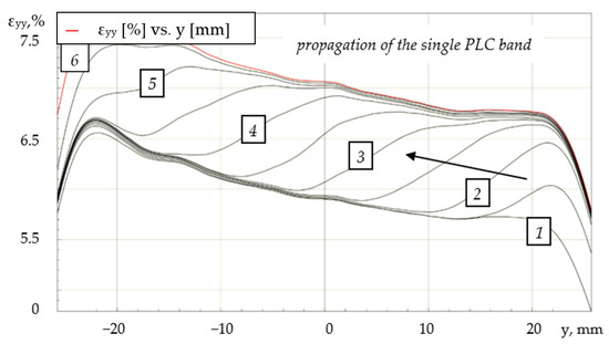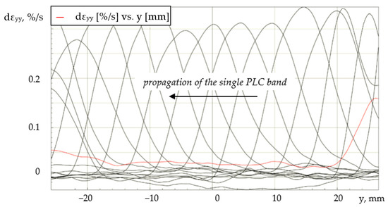 In Figure 12, the white arrow indicates the direction of movement of the PLC band. Based on the obtained data, a series of profiles of local rates of longitudinal strain with equal time intervals was plotted as well (Figure 13).