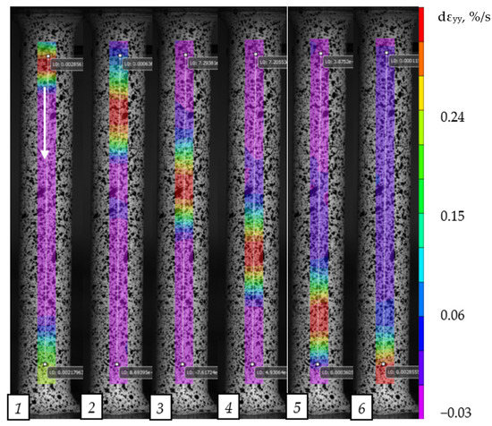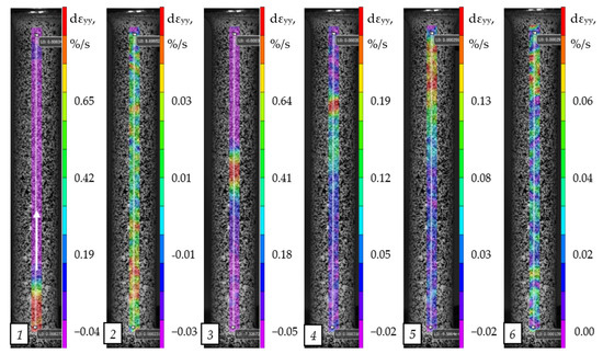 Evolution of local rates of the longitudinal strain fields on the surface of an Al-Mg alloy specimen in the case of a stiffness of 120 MN/m, numbers 1-6 corresponded to the plots of longitudinal deformations in the Figure 11.