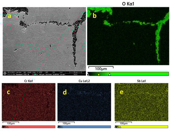 Moreover, due to the typical condition of non-grain-boundary equilibrium segregation during the cooling process of the billet, the segregation of elements at grain boundaries is also an important factor leading to the crack in the billet. As depicted in Figure 2, there is segregation of the elements Cr, Cu, and Sb. Anthony pointed out that non-equilibrium segregation is formed by the combination of solute atoms, vacancies, and solute atoms and high-temperature vacancies under certain conditions, and then a large number of complex bodies move to the grain boundaries during the cooling process [40,41]. The temperature difference of cooling determines the maximum degree of non-equilibrium segregation concentration. Usually, the greater the temperature difference of cooling process, the higher the segregation concentration, which is called the thermal gradient effect [42,43]. From the distribution of elements around the crack in the billet, it can be seen that Cr, Cu, and Sb are enriched near the crack, indicating that these easily segregated and high-content elements also play a significant role in crack initiation and propagation. For the grain boundary segregation of Cr, Kazuma et al. [8] reported that Cr shows high segregation energy at sites where the coordination number of the grain boundary is high and the grain size is large. Zhou et al. [14] summarized the work of G. Salje [44] and implied that when the temperature exceeds 925 °C, although the solubility of Cu in Fe increases to over 4%, the corresponding diffusion coefficient is very low. In continuous casting, the billet is heated above 900 °C, hindering the Cu in the grain boundary from diffusing into the steel matrix to create a copper-rich phase on the billet surface. There is a greater likelihood of crack formation along the grain boundary, notably for billets subject to bending and straightening deformation. In contrast, within the temperature range of 800–900 °C, there exists a region where the diffusivity of Cu and the solubility are both high. Thus, the segregation of Cu is severe and detrimental to the casting billets. As the typical low melting point element, Sb also has high tendency to segregate at the grain boundaries [45]. The segregation of Cu and Sb at grain boundaries of steel could weaken the grain boundaries, and the weakened grain boundaries were cracking under thermal stress [46].