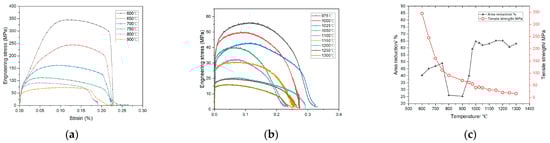Thermal tensile stress–strain curves (a,b) at different temperatures, changes in thermal tensile strength and reduction of area (c).