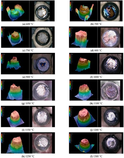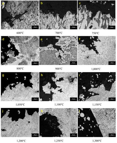 When the hot tensile temperature is above 1000 °C, the section shrinkage rate increases significantly to over 60%, the macroscopic fracture shows necking features (such as Figure 4f–h), and the section is relatively flat. The SEM morphology of the fracture shows shallower ductile dimples, as shown in Figure 5c. As the temperature further increases, there are many high-temperature molten beads on the fracture that are difficult to further analyze, but the necking features become more obvious, as shown in Figure 4d–i. When the temperature is above 1100 °C, the section shrinkage rate further increases and the necking features become more obvious, showing good high-temperature plasticity.