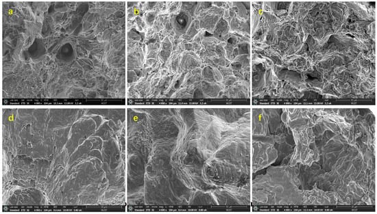 SEM morphology of hot tensile fracture at different temperatures: 600 °C (a), 700 °C (b), 750 °C (c), 800 °C (d), 900 °C (e), 1000 °C (f).