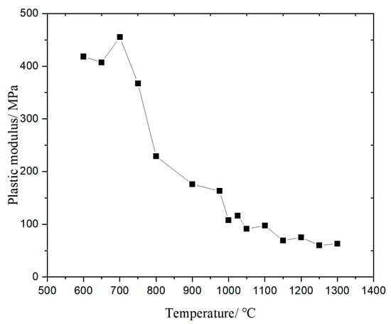 The relationship between the plastic modulus H and the temperature of the material, as shown in Figure 6, can be obtained by processing the true stress–strain curves under different temperatures. The n values in the fitting process are distributed in the range of 0.05 to 0.5, indicating a good fitting result [23]. From the variation of the plastic modulus obtained by the fitting with the temperature, the overall trend of the plastic modulus is decreasing. At temperatures of 600–750 °C, the plastic modulus value is relatively large but the change relatively flat, with the highest value appearing at 700 °C. When the temperature is above 750 °C, the plastic modulus value rapidly decreases, and the change slows down after 900 °C. The highest value appears again at 975 °C, and finally slowly decreases with the increase of temperature. From the results of the high-temperature plastic modulus, it can be seen that the plasticity of 09CrCuSb steel is poor around 700 °C, so it should be avoided as much as possible to have significant deformation at 700 °C during hot rolling. When the temperature is above 800 °C, the plastic deformation ability of 09CrCuSb steel also decreases significantly, so in the continuous casting process, the two-water control process should also avoid the billet staying at a temperature of 800–975 °C for a long time [21].