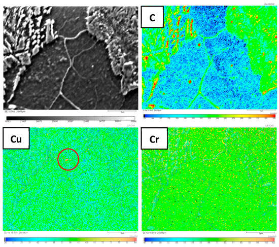 The EPMA analysis of the crack near the tested area under 800 °C thermal tensile conditions are depicted in Figure 8. The elemental map indicates a higher content of carbon in the bainites and at the grain boundaries of proeutectoid ferrites. Furthermore, Cu exhibits clear segregation at the ferrite triple junctions as red circled in Figure 8, whereas there is no noticeable segregation behavior for Cr. Zhou et al. [14] have similarly concluded that elevated temperatures during continuous casting exhibit a high level of Cu solubility, with a thermal threshold exceeding 900 °C. Yet, the low diffusion coefficient of Cu within Fe presents a substantial obstacle for the material to infiltrate the steel matrix, particularly where the grain boundary has experienced Cu buildup.