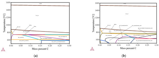It should be noted that compared with the old version of the energy standard NB/T47019-2011 [27], the newly issued NB/T47019-2021 standard has increased the content of proeutectoid-forming elements such as Cr, Mo, Si, Nb, Al, and Ti [28,29], which is represented by the Ae3 temperature increasing from 855 °C to 880 °C on the phase diagram, as calculated by the Thermal-Calc software in Figure 9. Ae3 temperature represents the beginning temperature of the thermodynamic austenite–ferrite transformation [30,31,32,33]. It can be seen that the increase of alloy elements means that the transformation time of proeutectoid ferrite during the cooling process is advanced due to the increase of Ae3 temperature [33,34]. It also means that during the cooling process, the formation of ferrite will happen before it would in steel [35]. Therefore, when the slab enters the straightening machine during continuous casting, the surface temperature due to the effect of reheating should return to above 800 °C. The expansion of the two-phase region leads to the extension of the insulation time of the billet in the two-phase region, and proeutectoid ferrite precipitation is also promoted when the grain boundary satisfies certain thermodynamic conditions. Given the crucial role of proeutectoid ferrite formation, it is important to give due consideration to carbon content. The diffusion of carbon atoms into the inner part of the austenite results in the duplication of the original austenite grain boundary, which is responsible for the eutectoid ferrite as well [11,36]. At the same time, some scholars have pointed out that in steels with high microalloyed element content, carbon and nitrogen will precipitate and aggregate at the grain boundaries [37,38,39], further deteriorating the high-temperature mechanical properties of the III brittle zone and causing transverse cracks and corner cracks in the billet.