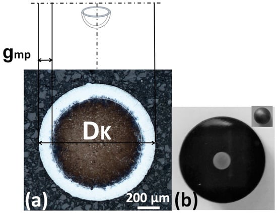 Metallographic tests were carried out on the above-mentioned balls. Grinding the balls to their diameter, a layer of nitrides of actual thickness was observed and measured on metallographic microsection. In addition to the iron nitride layer, called the white layer (WL; its thickness is labeled gmp; see Figure 1a), we also observed and measured the thickness of the porous zone (gpor; see Table 3 and comments in 3.1). Figure 1 shows a method for measuring the thickness of the iron nitride layer [].