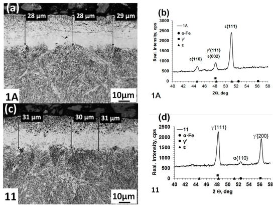 On the diffractogram of the surface of the nitrided sample (1A), the dominant phase in the layer was the ɛ phase; all the characteristic lines from the ɛ phase were recorded in the range of the 2Θ angles studied (Figure 2b). The low intensity and the absence of the characteristic lines of the γ′ {200} and γ′ {111} planes indicate that the amount of the γ′ phase in the layer did not exceed 5% of the mass (see Table 4).