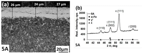 On the AISI 1085 steel (sample 5A), a layer of iron nitrides with a thickness of gmp = 25 ± 1 μm was formed in the nitriding process (Table 3); in this layer, a lighter zone with poor etching on the substrate and a more etched porous zone with a thickness of gmp = 10 ± 1 μm on the surface can be distinguished (Figure 3a). On the diffractogram of the surface of the nitride sample (5A), the predominant phase in the nitride layer was the ɛ phase (Figure 3b); the content of the ε phase in the iron nitride layer was 87% (Table 4). All the characteristic lines of the ɛ phase in the range of the 2Θ angles were tested. The low intensity of the characteristic line of the γ′ {111} plane and the low intensity of the characteristic line of the γ′ {200} plane indicate that the amount of the γ′ phase in the layer did not exceed 15% by weight.