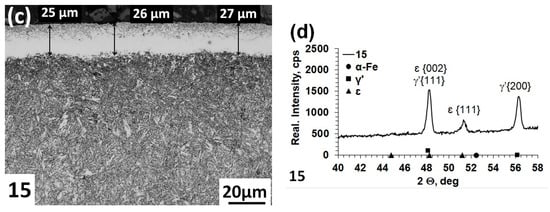 After the annealing process, the steel structure (sample 15) did not change significantly. In the microstructure, there was a layer of iron nitrides with a thickness of gmp = 25 ± 1 μm (Table 3). The thickness of the light, poorly etched zone decreased slightly, while the thickness of the porous zone (gpor) increased to 12 ± 1 μm (Figure 3c). The degree of porosity of the zone increased. The process significantly changed the phase composition of the iron nitride layer. After the nitriding process, the iron nitride layer was a mixture of ɛ and γ′ phases. During annealing, only part of the ɛ phase evolved into the γ’ phase according to the ɛ→′ɛ + N↑ reaction, so the iron nitride layer was a mixture of ɛ + γ′ + γ′ɛ phases. In the iron nitride layer, next to the γ′ phase formed by the nitriding process, there was also a γ′ɛ phase formed as a result of the ɛ phase transformation (Figure 3d). X-ray studies of sample 15 found that the characteristic line of the ɛ {110} plane disappeared. The intensity of the ɛ {111} line decreased significantly; the intensity of the γ’ {200} line and the intensity of the lines of the γ′ {111} and ɛ {002} planes increased. In the doublet of these phases, the number of γ′ phases increased. As a result of the ε-Fe2–3N phase transformation, the content of the γ′-Fe4N phase in the white layer increased. The lattice parameters of γ′ phase increased slightly; the lattice parameters of the ε phase decreased (Table 4).