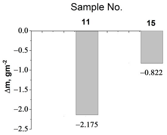 Change in sample weight, Δm/m2 (samples 11 and 15), after annealing.