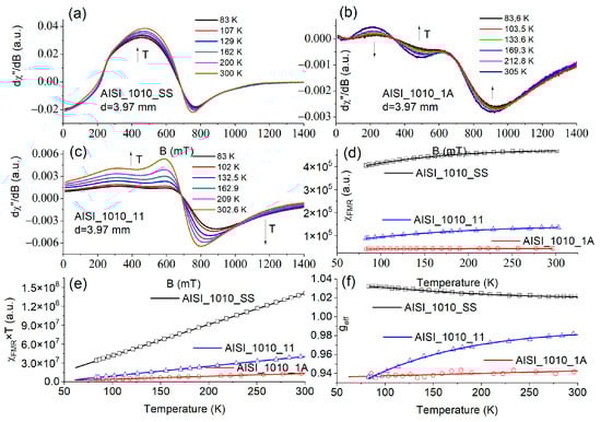 FMR spectra of the AISI_1010 sample; d = 3.97 mm. (a–c) Temperature dependence of FMR spectra of initial sample (SS), nitrided sample (1A), and nitrided and annealed sample (11), respectively; (d–f) temperature dependencies of the FMR magnetic susceptibility, χFMR; magnetic moment square, χFMR × T; and FMR signal resonant position, geff, respectively.