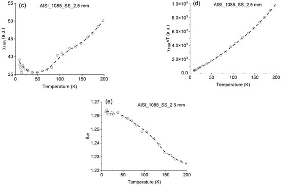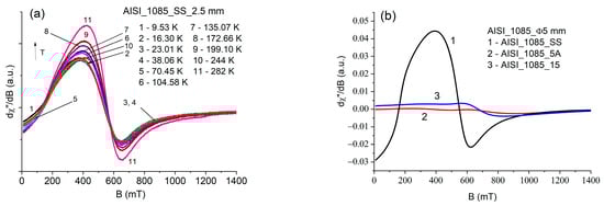 The inserts in Figure 6a,c–e show the same relationships as those in Figure 5, but the magnetic susceptibility, magnetic moment, and resonance position are shown for the AISI 1085_SS_2.5 mm sample and not the AISI 1085_SS_5 mm sample. The FMR spectra of the second type of samples (SS, 5A, and 15) measured at T = 295 K are shown in Figure 6b.
