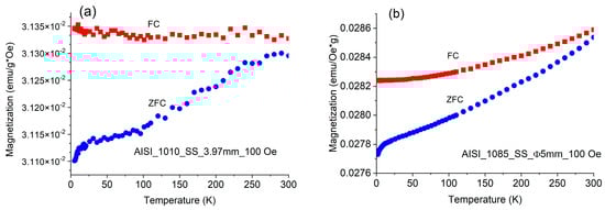 Figure 7a, b shows the magnetization measurements of the initial samples, SS, of the AISI 1010 and AISI 1085 steels in a magnetic field of 100 Oe. As can be seen, the samples are characterized by high magnetic anisotropy at lower temperatures and an unusual dependence on temperature over the entire temperature range of 3–300 K. This confirms the previous FMR observations (see Figure 5d and Figure 6c). Magnetic anisotropy tended to disappear at a temperature of about 300 K. Measurements were made in the FC and ZFC modes. For the tested samples, their magnetization was relatively weaker when the tests were carried out in a stronger magnetic field. Moreover, the magnetic susceptibility of this type of steel appears to be dependent on the carbon content.