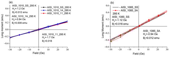 (a) Hysteresis loops of the AISI 1010 samples and (b) hysteresis loops of AISI 1085 samples; T = 295 K.