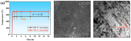 The Ti-6Al-4V alloy block with a size of 65 × 15 × 15 mm was built using a powder bed fusion using a laser beam (PBF-LB) AM machine (EOS M280). The composition of raw powder is 6.18 Al, 4.06 V, 0.17 Fe, 0.09 O, 0.0058 N, 0.011 C, and balance Ti (wt. %). The processing parameters are as follows: laser power 280 W, scan speed 1200 mm/s, hatch space 0.14 mm, and layer thickness 0.03 mm. A raster scan pattern with 67-degree rotation per layer was adopted. The original porosity of the Ti-6Al-4V bulky sample is less than 0.01%. Post annealing treatments were utilized for decomposing metastable phases (martensitic α′) and metastable factors (nano-twins and dislocations), as shown in Figure 1. To avoid the excessive coarsening of α lath and massive formation of brittle Ti3Al phase, the post annealing treatments are held at 550 °C and 700 °C, respectively. The heat treatments are held under the argon protective atmosphere to avoid oxidation. Different from the conventional annealing treatment, which only lasts for 1–4 h, the annealing duration is prolonged to 16 h to decompose the martensitic α′ sufficiently.