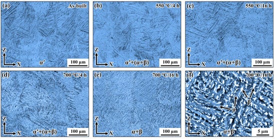 The EBSD inverse pole figure (IPF) orientation maps of the as-built and heat-treated Ti-6Al-4V alloys are presented in Figure 3. Overall, annealing at 550 °C only has a marginal influence on the microstructural morphology, while annealing at 700 °C coarsened the microstructure significantly (Figure 3f). Notably, the acicular morphology in the as-built state (Figure 3a) was transformed into the lath morphology (Figure 3e) after annealing at 700 °C for 16 h. The altered phase morphology could be beneficial for achieving higher work-hardening capacity, because the stress concentration at the acicular tip can be avoided during deformation. Meanwhile, this indicated that the martensite was fully decomposed after the 700 °C annealing treatment.