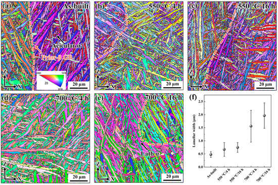 EBSD IPF orientation maps of the (a) as-built, (b) 550 °C/4 h, (c) 550 °C/16 h, (d) 700 °C/4 h, and (e) 700 °C/16 h samples; (f) lamellar width of the samples.