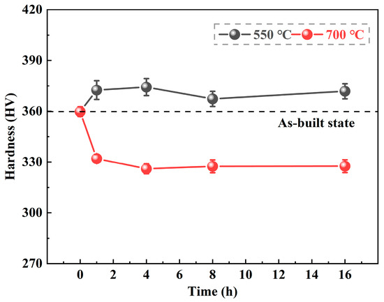 The micro-hardness of the as-built and heat-treated Ti-6Al-4V alloys are presented in the Figure 4 and Table 1. Annealing at 550 °C increases the hardness of the as-built alloy slightly, which could be related to the formation of nano-sized β and Ti3Al precipitates during the 550 °C annealing [25]. In contrast, annealing at 700 °C for 4 h reduces the hardness of the alloy by ~30 HV. Further prolonging the annealing time to 8 h and 16 h does not affect the hardness anymore. A similar phenomenon has also been observed in a β-quenched Ti-6Al-4V alloy [23].