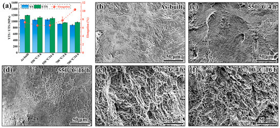 Tensile properties and fracture morphology: (a) tensile properties of the as-built Ti-6Al-4V alloy subjected to various annealing treatments; fracture morphologies of the (b) as-built, (c) 550 °C/4 h, (d) 550 °C/16 h, (e) 700 °C/4 h, and (f) 700 °C/16 h samples.