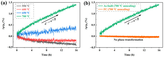 In situ electrical resistivity results: (a) the relative increase in the resistivity of the as-built Ti-6Al-4V alloy subjected to various annealing treatments; (b) comparison of the in situ electrical resistivity curves of the as-built Ti-6Al-4V alloy and the FC-treated Ti-6Al-4V alloy under annealing at 700 °C/16 h.