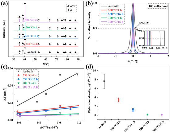 During the annealing treatments, the dislocations evolutions also play a significant role in controlling the mechanical behavior on the alloys [28]. In this section, the LPA of XRD is used to investigate the dislocation density evolutions of the alloy. The phase identification is based on the standard XRD diffraction pattern: JCPDS file #44-1294 (the hexagonal α-Ti) and JCPDS file #44-1288 (the cubic β-Ti). As presented in the XRD patterns in Figure 7, the peak of β phase (~39.4°) became obvious with the annealing treatment. In the as-built state, only peaks of α′ can be found, indicating the microstructure is full martensitic α′. Under annealing at 700 °C for 16 h, the intensity of the β phase peak is the highest among these samples, indicating the highest fraction of β phase. The co-occurrence of α and β phase peaks indicates that a dual-phase α + β microstructure is obtained, which corresponds with the microstructural observations in Figure 2 and Figure 3. The normalized 100 reflection of all of the alloy samples is presented in Figure 7b. Obviously, the FWHM of the as-built alloy is much higher than that of other heat-treated alloys, indicating the highest dislocation density. The mWH plot in Figure 7c further demonstrates this trend, because the slope of the mWH line is positively related to the dislocation density [23]. Notably, the measured dislocation density only takes the α′/α phase into consideration, and the β phase is not considered owing to the negligible dislocation density in the newly formed β phase. Annealing at 700 °C reduced the dislocation density of the as-built alloy significantly. After annealing at 700 °C for 4 h, 98% of the dislocations were eliminated, thus further prolonging the annealing time only has a marginally influence on the dislocation density. The reduced dislocation density in the α lath could provide space for storage of dislocations, which is beneficial for achieving high work-hardening capacity and superior ductility.