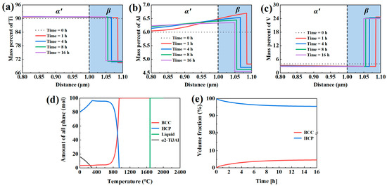 As presented above, the martensitic α′ of the as-built Ti-6Al-4V alloy was decomposed into the lamellar α + β after post annealing treatments. Fundamentally, the phase transformation behavior is dominated by the partitioning of the alloying elements (i.e., Al and V). Because the phase transformation is more obvious at 700 °C annealing, the DICTRA simulation is performed at 700 °C for 0–16 h to reveal the alloying elements’ partitioning behavior during the annealing treatment. Obviously, the V elements were accumulated into the β phase gradually under annealing, while the Ti and Al elements were depleted from the β phase, as shown in Figure 8. During annealing at 700 °C, the mass percent of V at the α′/β phase boundary is stable (Figure 8c). Further annealing leads to the gradual segregation of V into the β phase. In contrast, the Al contents at the α′/β phase boundary are gradient during annealing at 700 °C for 0–16 h (Figure 8b), which could be related to the faster diffusion rate of Al than that of V [29]. Overall, these phenomena indicated that the Al depletion and V segregation stabilized the β phase, thereby promoting the decomposition of martensitic α′ (Figure 8e).