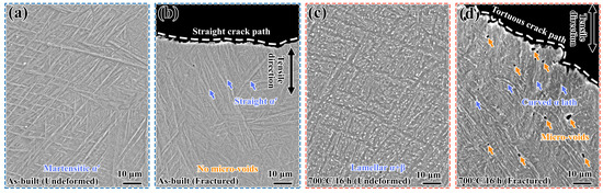 Figure 9 presents the side surface of the fractured tensile samples of the as-built and 700 °C/16 h alloy samples. For the as-built alloy, the microstructure of the fractured region is dominated by the straight acicular α′ (Figure 9b), which is similar to the undeformed state (Figure 9a). This indicated that the hard martensitic α′ phase almost cannot be deformed during the tensile deformation, which corresponds to the poor ductility (~7.3%). Meanwhile, the fracture crack path is relatively straight and no micro-voids can be found in the fractured sample, indicating a typical brittle fracture mechanism. In contrast, the curved α lath and numerous micro-voids can be observed in the fractured 700 °C/16 h tensile sample, indicating that the β phase accommodated the plastic deformation during the tensile test [30]; thus, the work-hardening capacity was improved. Besides, the crack path exhibited a tortuous morphology (Figure 9d), representing that the α/β phase boundary effectively inhibited the propagation of the crack path [31].
