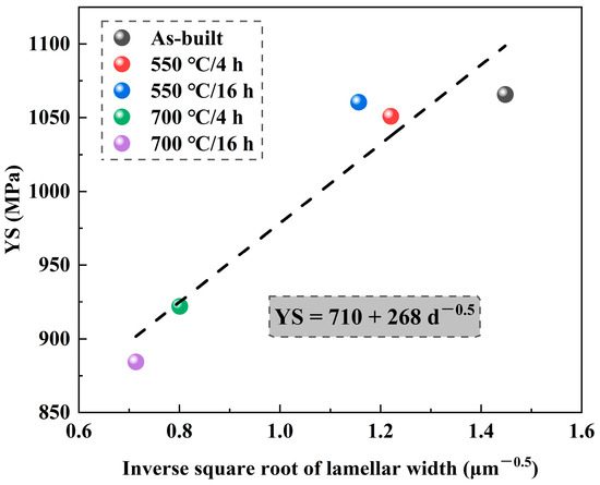 Figure 10 presents the relationship between the yield strength with the inverse square root of lamellar width of α′/α lath. Obviously, a Hall–Petch relationship can be found between the YS and the lamellar width, which has also been reported in other works [13,23]. This indicates that the grain boundary strengthening plays a major role in determining the YS of the alloy. The decrease in dislocation density does not affect the YS significantly. The reason can be attributed to the fact that the dislocations formed by the martensite transformation are mainly mobile dislocations, which has only marginally contributions to the overall YS [9,23]. In addition, the ductility of the as-built Ti-6Al-4V alloy was increased by 700 °C annealing. After annealing at 700 °C for 16 h, the ductility of the alloy reached 10.3%. The in-depth mechanisms for ductility improvements are as follows: (i) the reduced dislocations in the α lath provided substantial space for storage of dislocations during deformation; (ii) the β phase formation induced by alloying element partition accommodated the strain, thereby further increasing the ductility; and (iii) the acicular α′ transformed into lath α + β after the annealing treatment, which could avoid the stress concentration at the acicular tip during the tensile deformation.