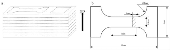 (a) Relative orientation of the tensile samples and square plate samples cut from the as-printed bulk sample, (b) dimensions of the tensile samples. BD indicates the build direction.