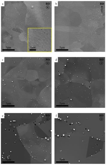 Figure 2 shows the microstructure, as seen under SEM observation, of samples in the as-printed state (as viewed parallel and perpendicular to the BD) and after different annealing times (as viewed along the BD). A substructure corresponding to dislocation cells with a 3D prismatic morphology [,] is present in the as-printed sample (see the magnified view in Figure 2a), appearing either as an equiaxed or a striped structure in different locations, depending on the inclination of the prismatic structure to the sectioning (observation) plane. The size of the cellular substructure, as defined by the equiaxed cell diameter, is typically in the range of 600–800 nm. A large number of precipitate particles are also present in the as-printed sample, and are mainly located at the boundaries forming the prismatic cellular substructure. The oxygen content in the as-printed samples was measured by infrared absorption method as 0.05%.