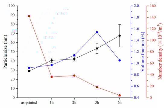 With increasing heat treatment time, the cellular substructure in non-recrystallized regions becomes less and less visible under SEM observation, and the number density of precipitate particles decreases. After 6 h, when the sample is almost fully recrystallized, the particles are predominantly distributed on the recrystallized grain boundaries. The average size of the precipitate particles, as determined from SEM observation, increases from about 28 nm in the as-printed state to 66 nm after annealing at 1000 °C for 6 h, with the volume fraction of particles increasing until the annealing time reaches 3 h, as shown in Figure 3, followed by a small decrease.