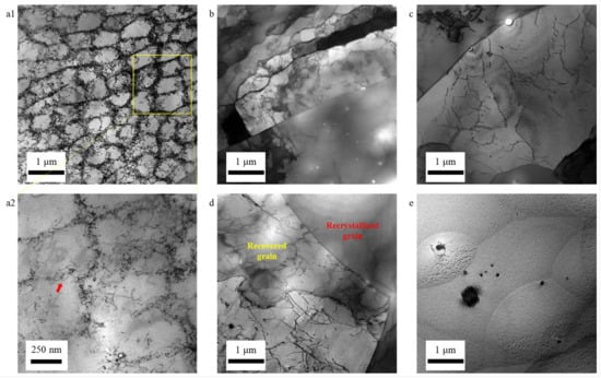 After 1 h of annealing, dislocation cells similar to those in the printed sample are still observed in some areas, with almost no change in size but with a significant decrease in the cell wall thickness, where the cell walls no longer consist of a high density of entangled dislocations. In other places, however, dislocation cells are no longer visible, or are only weakly visible, indicating extensive recovery has taken place. The oxide particles both coarsen and decrease in number density substantially after 1 h annealing, consistent with the results observed through SEM observations (Figure 4b). After 2 h annealing, the dislocation density in non-recrystallized volumes is further reduced, with weakly defined dislocation cell arrangements observed, and in some places, dislocation arrays forming low-angle boundaries are clearly visible (Figure 4c). Similar features are observed in non-recrystallized volumes after 3 h annealing, with the obvious presence of recrystallized grains also observed in the examined TEM thin-foil samples (Figure 4d). After 6 h annealing, most of the sample is fully recrystallized, and TEM observation reveals only a typical low dislocation density (Figure 4e).