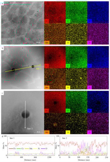 The existence of oxide particles in SLMed 316L SS has frequently been observed by many researchers, though only a few studies have investigated the formation mechanism, with the most popular opinion being that the oxygen contained in the powder will remain in the matrix, where it can react with high-oxygen-affinity elements in steel to form inclusions [,]. Some other studies have suggested that oxygen in the chamber will also promote the formation of oxide particles [,]. Despite their unclarified formation mechanism, oxide particles have been found to be important in the formation of dislocation cell structures through their ability to pin mobile dislocations [,]. These microstructural features also play an important role in the improvement of mechanical properties and thermal stability of SLMed 316L SS.