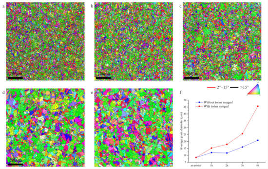 EBSD orientation maps of the SLM 316L samples plotted using inverse pole figure coloring according to the BD: (a) as-printed, and annealed at 1000 °C for (b) 1 h, (c) 2 h, (d) 3 h, and (e) 6 h; (f) variation in average grain size with annealing time, showing values calculated both where twins are merged (not counted) or not merged (counted). For the EBSD data, in each case, the viewing direction is parallel to the BD.