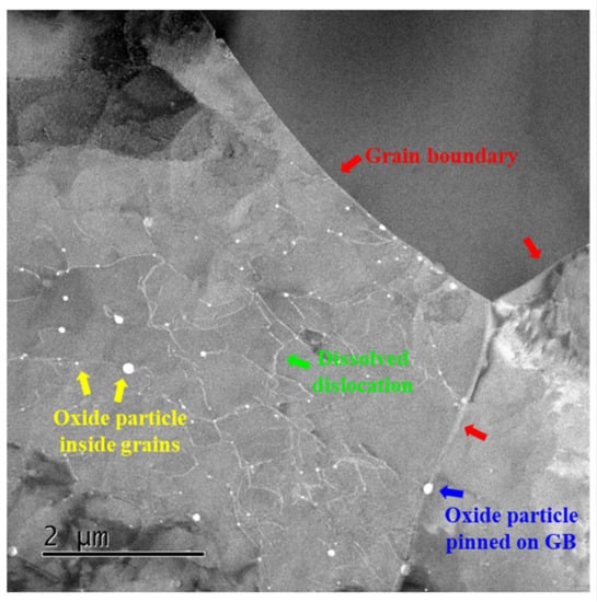 Full recrystallization requires at least 6 h at an annealing temperature of 1000 °C for the SLM 316L stainless steel, indicating a significant delay in recrystallization. Nanoscale precipitates are a well-known cause of slow recrystallization kinetics in LPBF 316L SS due to their pinning effect on grain boundaries [,,]. Local variations in particle density may also play a role in the recrystallization kinetics. A local characterization of a sample annealed for 3 h in TEM, shown in Figure 7, illustrates differences both in the intragranular oxide particle density, and in the distribution of oxide particles at grain boundaries, suggesting different recrystallization rates between different grains.