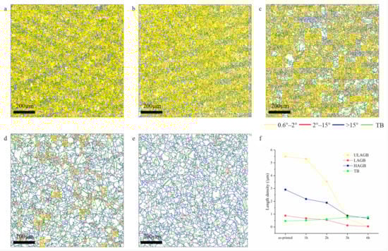 EBSD orientation maps of the SLM 316L samples showing boundary misorientations in different angle ranges: (a) as-printed, and annealed at 1000 °C for (b) 1 h, (c) 2 h, (d) 3 h, and (e) 6 h; (f) variation of length density (LA) for the four ranges/types of boundaries analyzed.
