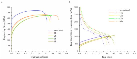 (a) Engineering stress–engineering strain curves and (b) true stress/work hardening rate–true strain curves of as-printed and annealed samples.