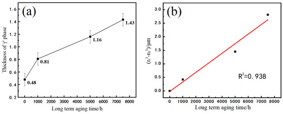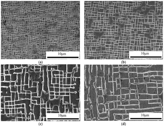 Figure 2 shows the microstructure of DD6 alloy after long-term aging for a certain time obtained by SEM. After the thermal treatment (1290 °C, 1 h 1300 °C, 2 h + 1315 °C, 4 h air cooling + 1120 °C, 4 h air cooling + 870 °C, 32 h air cooling), the γ′ phase was cubic and uniformly distributed (Figure 2a). The average size and volume fraction were calculated using the intercept method to be 0.48 μm and 63%, respectively. When the above alloy was aged in air for long time (1000, 5000, 7500 h) at 980 °C, the γ′ phase grew up with the prolonging of aging time. Meanwhile, the channel width of the γ matrix was enlarged, the γ′ phase was marginally passivated, and the cubic metric gradually decreased. Figure 3a shows the relationship curve between the γ′ phase and the long-term aging time. Clearly, the sizes of the γ′ phase under the above aging time periods were 0.48, 0.81, 1.16, and 1.43 μm, respectively. When the aging time was longer than 5000 h, the size of the γ′ phase exceeded 1 μm. Size computation of the γ′ phase showed the local γ′ phase was coarsened, connected, and combined. When the aging time was shorter than 1000 h, the γ′ phase was coarsened, but it reserved the cubic shape. Compared with the structures without aging, the overall morphology did not change greatly (Figure 2a) and no TCP was separated out, which are consistent with other studies [15,24]. When the aging time was up to 5000 h, the size of the γ′ phase was significantly enlarged, the matrix channels were broadened, and the cubic degree of the γ′ phase decreased. The γ′ phase connected and combined along the <100> and <010> directions to form irregular strips and an L shape. Moreover, evident rafting occurred and, finally, the γ′ phase directionally grew up, forming rafting structures (Figure 2c). When the aging time was 7500 h, the structure morphology was similar to that after 5000 h of treatment, and the structure rafting was more significant (Figure 2d). These results indicate the size of the γ′ phase changed and its shape varied along with the prolonging of aging time. Therefore, the mechanism of γ′ phase transformation in DD6 alloy after long-term aging shall be analyzed.