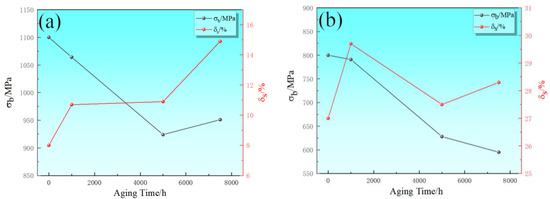 - D6 alloy after 1000 h, 5000 h, and 7500 h long-term aging treatment: for the alloy at 760 °C, the tensile strength first decreases and then increases with the extension of the aging time, and the minimum value appears at 5000 h; at 980 °C, the tensile strength decreases gradually with the extension of the aging time, and the elongation increases first and then decreases, reaching the maximum value at 2000 h. With the extension of the aging time, the lasting life is showing a decreasing trend; when the aging time is 7500 h, the lasting life is significantly reduced;