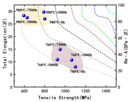 Then, the product of tensile strength and elongation (σb × δs/GPa%) was introduced to better reflect the strong plastic matching rule of the alloy at 760 or 980 °C. Figure 5 shows the schematic diagram of the strong plasticity matching rule. The product of tensile strength and elongation of the alloy with the aging time at 980 °C was computed to be 0.216, 0.235, 0.173, and 0.168 GPa%, respectively, indicating the product of tensile strength and elongation after 1000 h of aging was larger than that after thermal treatment. The product of tensile strength and elongation was reduced with the prolonging of aging time, but it did not change substantially beyond the aging time of 5000 h. The product of tensile strength and elongation with the aging time at 760 °C was 0.088, 0.114, 0.101, and 0.142 GPa%, respectively, indicating the product of tensile strength and elongation was the smallest when no aging was adopted. At this moment, the alloy strength was high, but the plasticity was low, and the alloy strength did not decrease largely after long-term aging, althought the plasticity was significantly increased. In all, at high temperature, the long-term aging largely affected the mechanical properties of the DD6 alloy, and this effect was especially significant when the aging time exceeded 5000 h.